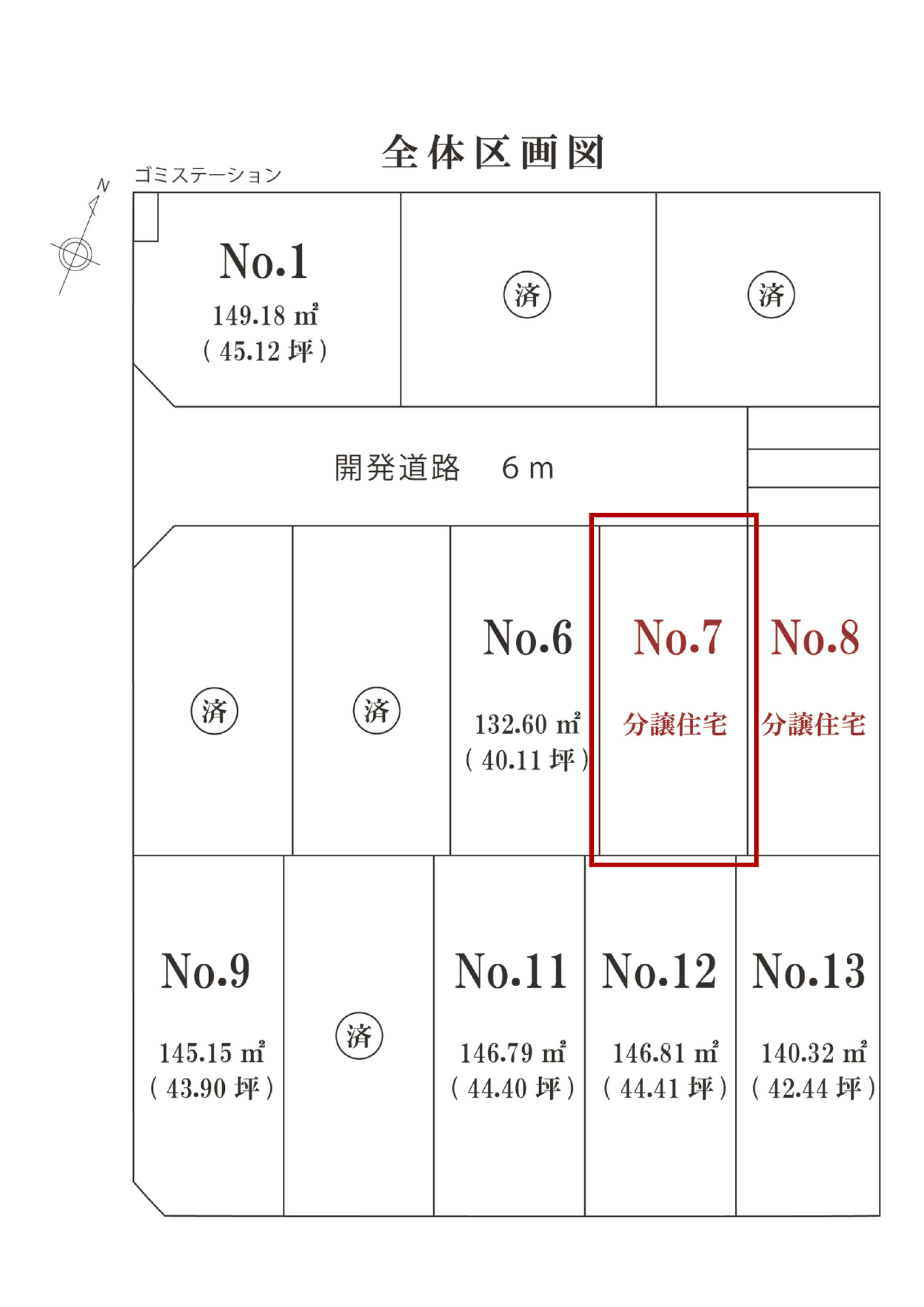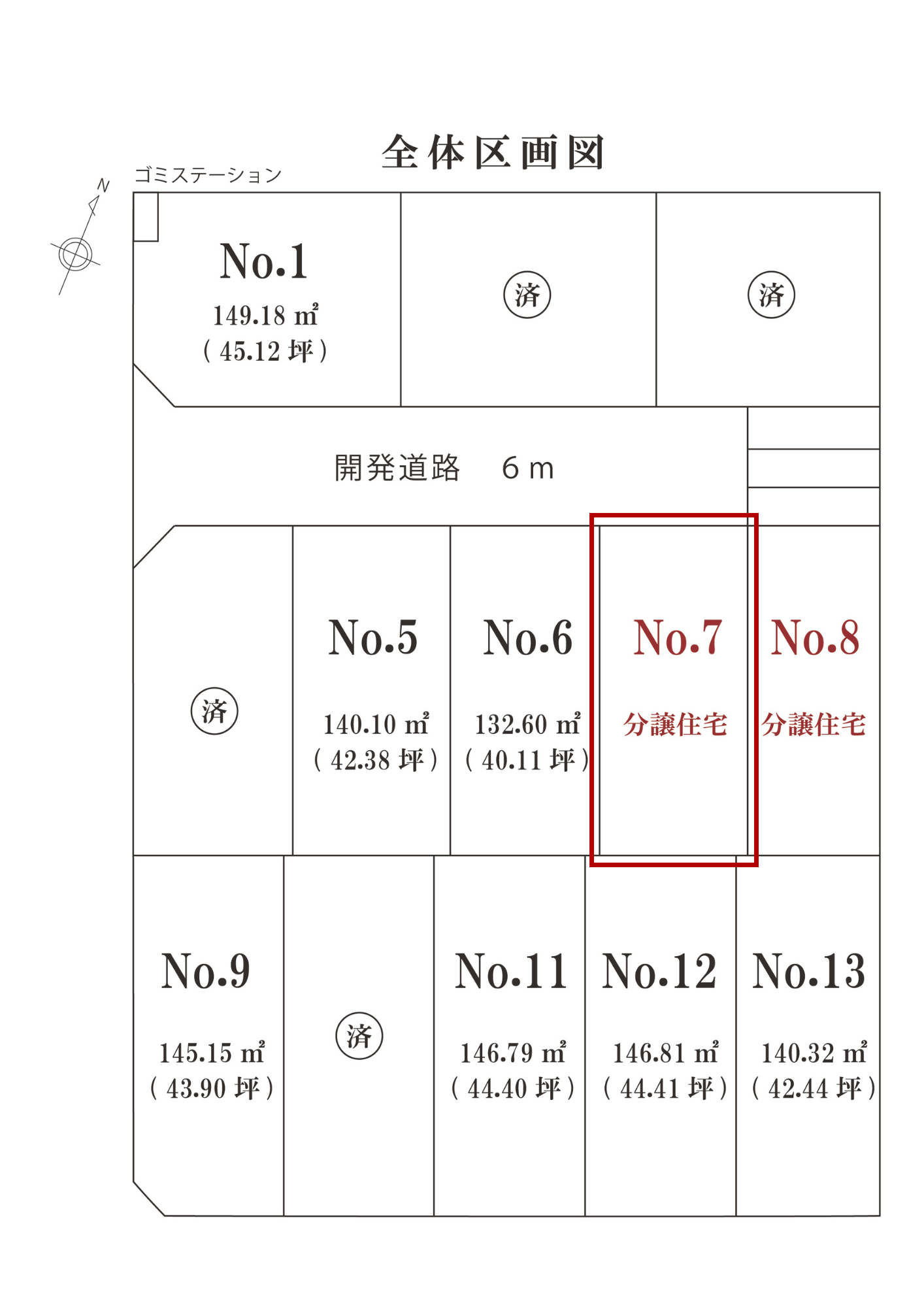 道路幅員/南側:約5.7m 西側:約6.8m 敷地内開発道路:6m●総区画数/13区画●建ぺい率/60%/●容積率/150%●設備/中部電力、都市ガス、公共上下水道●その他/上水道引込費用