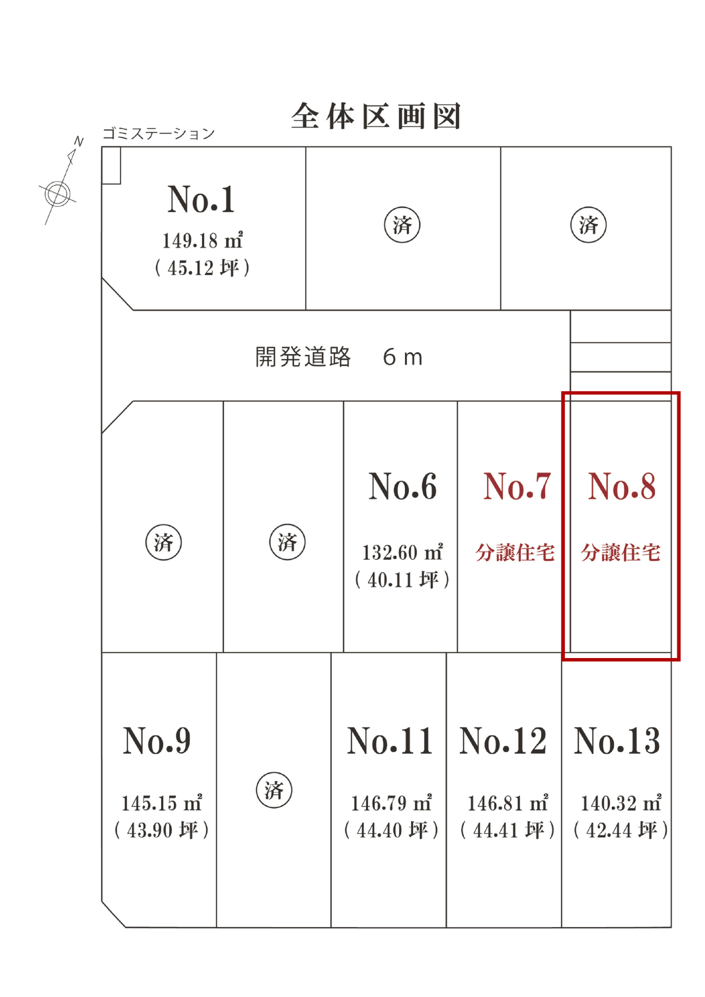 道路幅員/南側:約5.7m 西側:約6.8m 敷地内開発道路:6m●総区画数/13区画●建ぺい率/60%/●容積率/150%●設備/中部電力、都市ガス、公共上下水道●その他/上水道引込費用