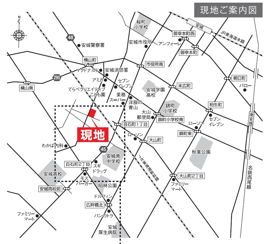 ●所在地/安城市百石町1丁目19-9他●交通/JR東海道線「安城」駅徒歩約23分●都市計画区域/市街化区域●用途地域/第一種中高層住居地域、建築基準法第22条区域●地目/宅地●
